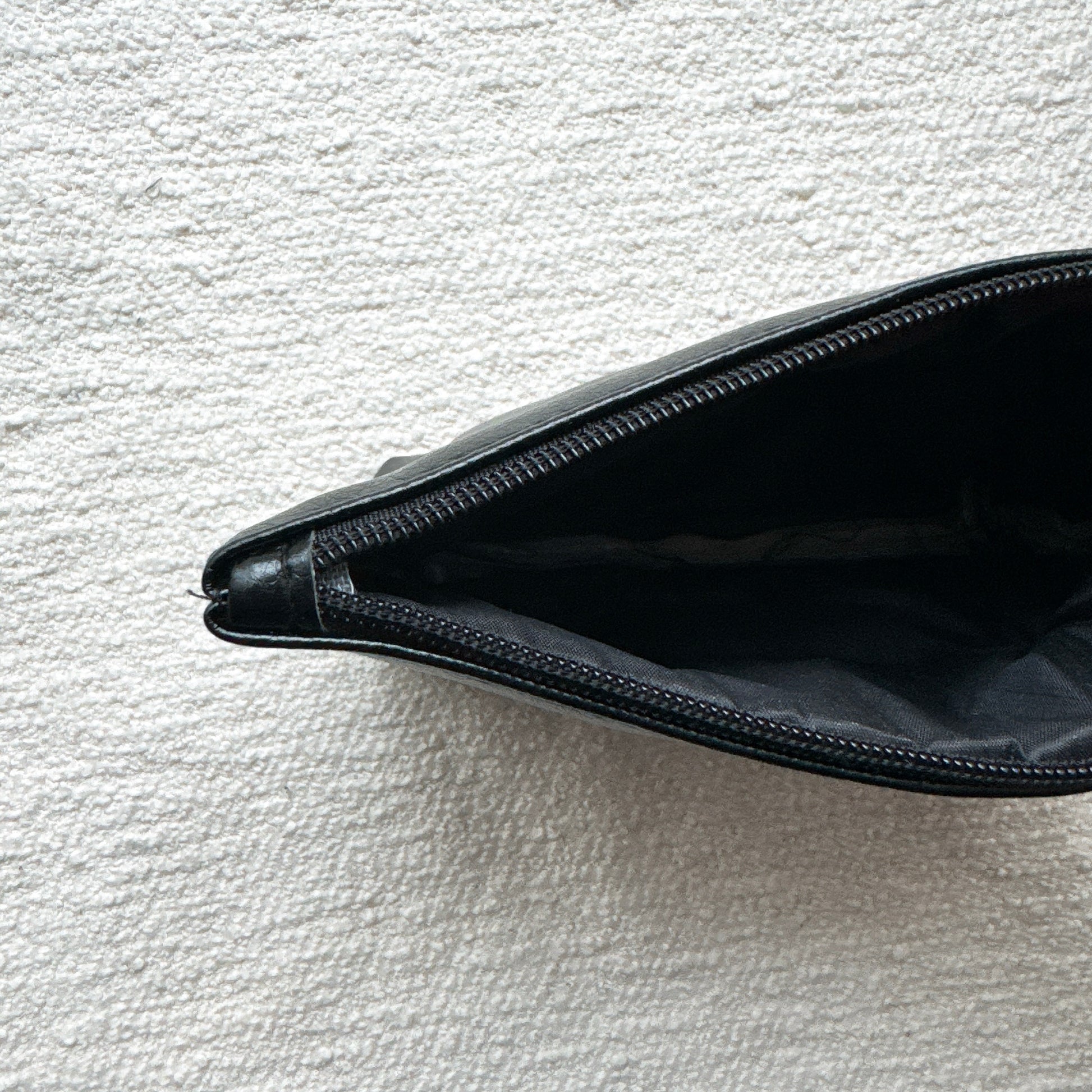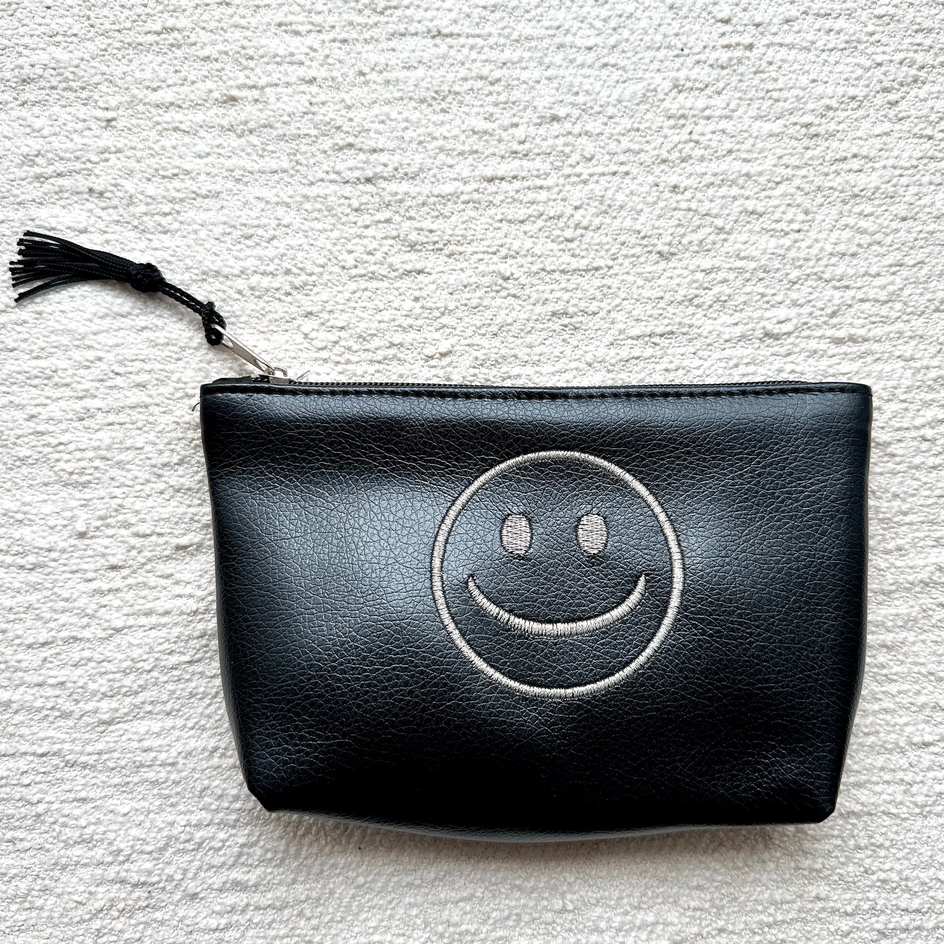 A pouch with a smiley face embroidered on it. It is a convenient size for storing small cosmetics and accessories. The inside is cushioned.